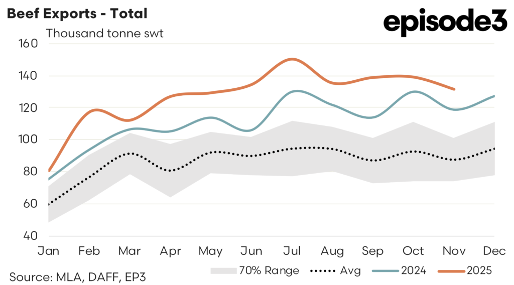 Australian beef exports softened in November, although the broader picture remains one of exceptional strength across all major markets. Total beef exports for the month reached 131,705 tonnes, a decline of 5 percent on October, yet still sitting approximately 50 percent above the five year average for November. This continues the run of elevated export volumes seen throughout 2025 and reflects a global demand environment that remains broadly supportive despite some expected seasonal recalibration.