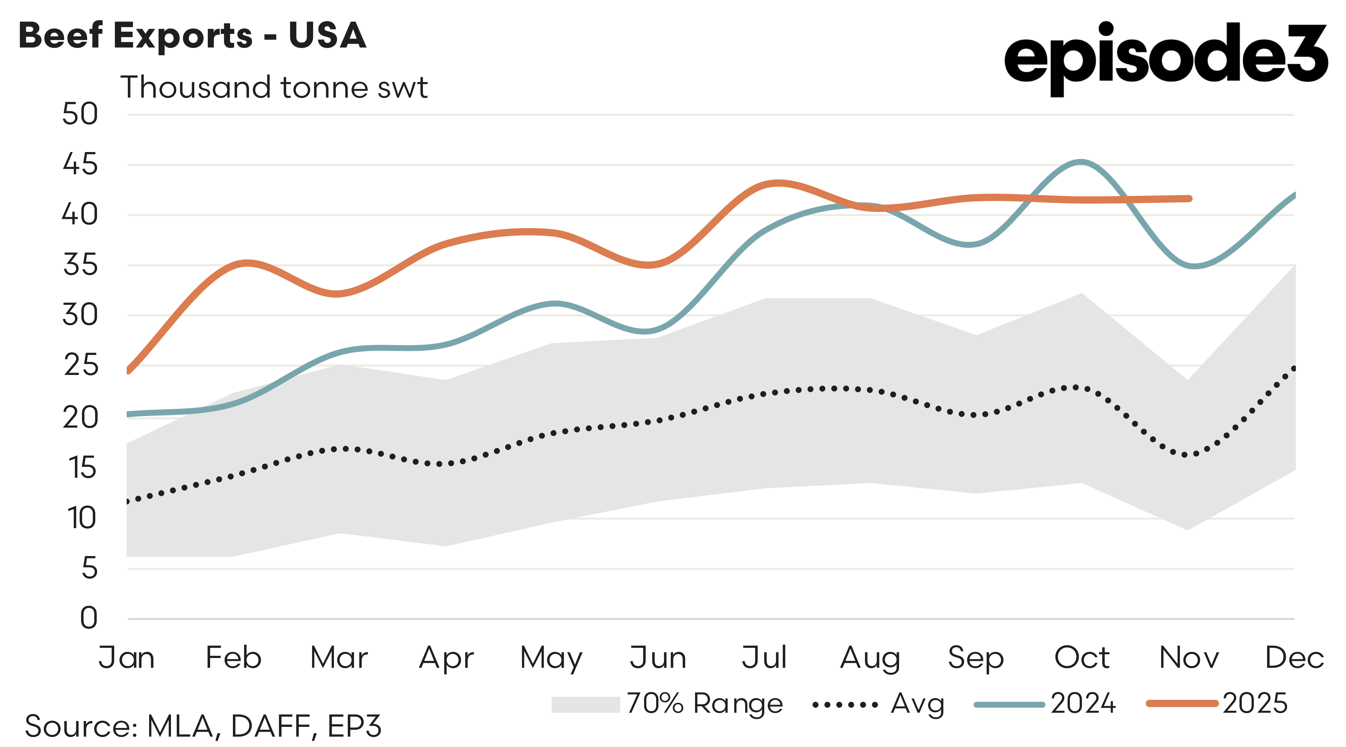 USA – Exports to the United States were effectively unchanged over the month at 41,676 tonnes. November often brings a modest easing in flows as the annual quota is normally close to exhausted by this point in the season, but this year has bucked that typical pattern. As of 1 December Australia still had around 1 percent of its US beef quota remaining. Shipments made in December will roll into the following year’s quota, so the industry is now set for a record year of beef exports to the United States for 2025. Because the usual November decline did not occur, current United States export flows sit at an extraordinary 155 percent above the five year trend for November, highlighting just how strong American demand has been relative to historic patterns.