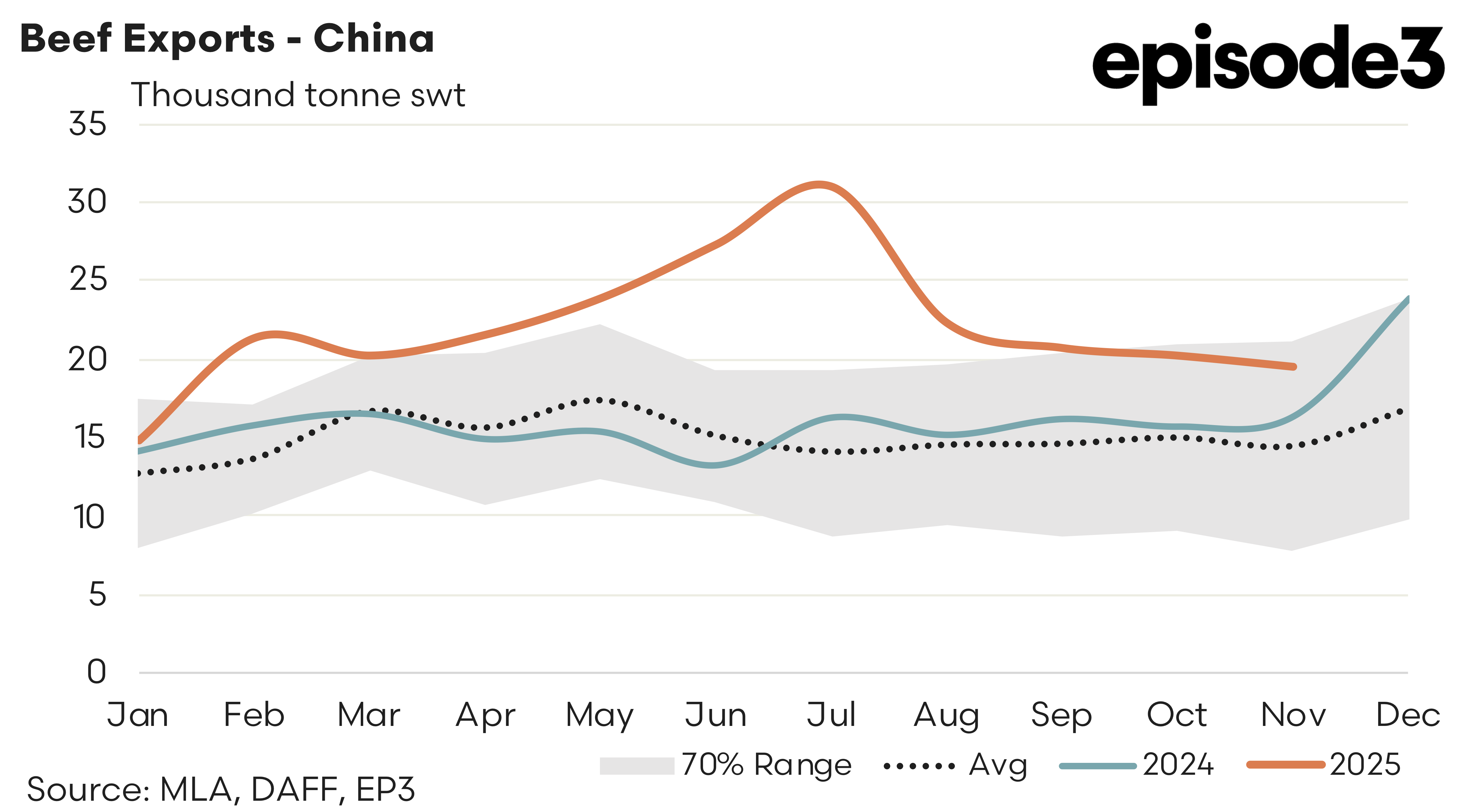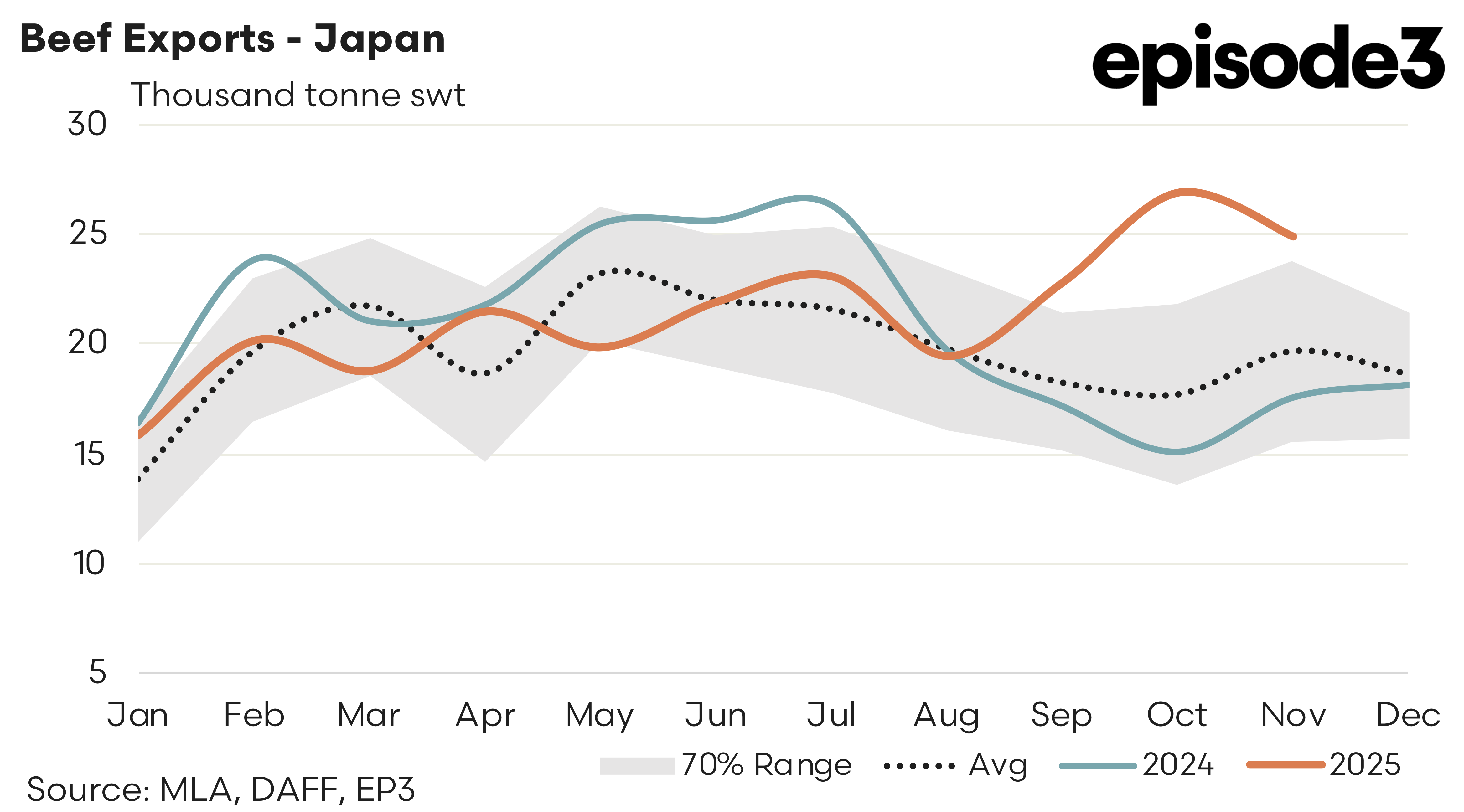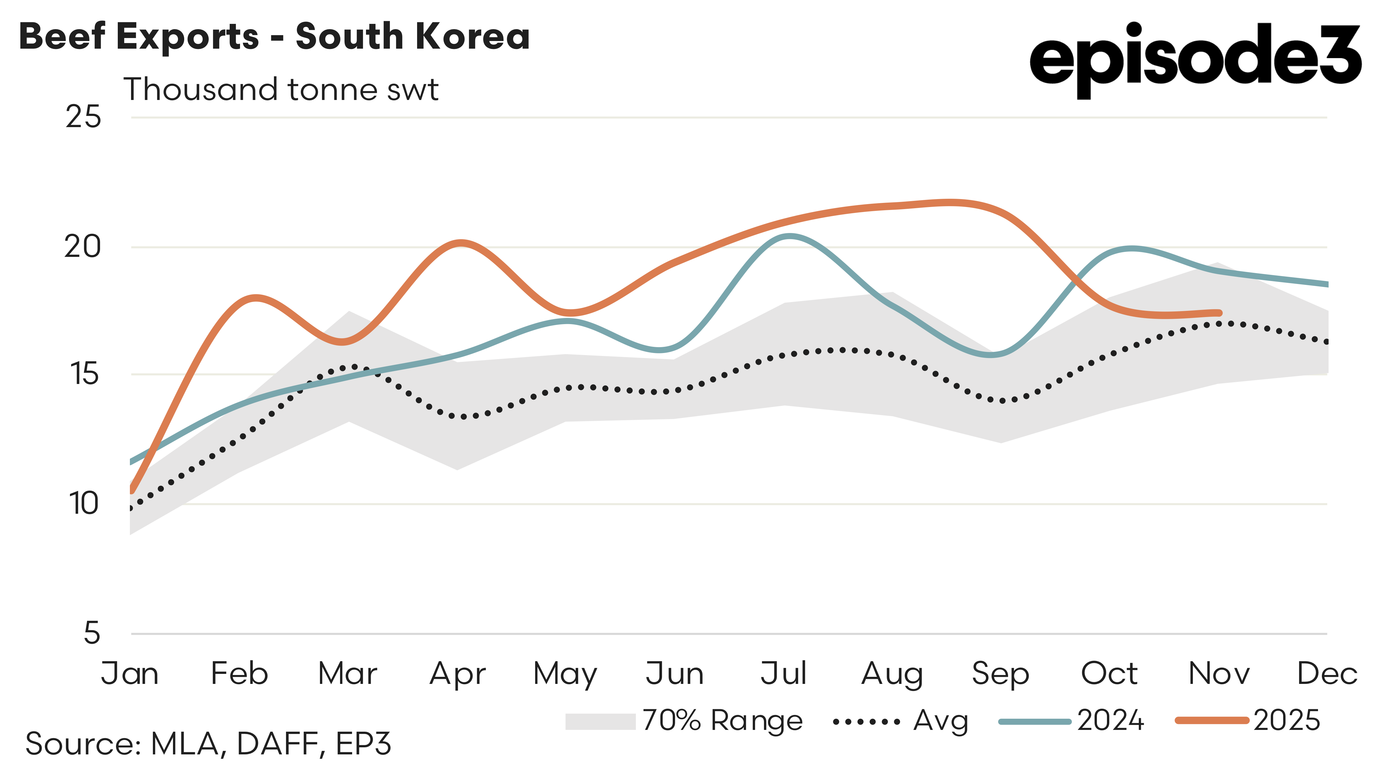 Japan – Japan also eased through November, with volumes stepping back by around 7 percent to 19,660 tonnes. Despite that correction, demand from Japan remains notably strong. At present, shipments into the Japanese market sit roughly 27 percent above the five year average for November. This indicates that the underlying appetite for Australian beef remains robust and that the recent easing is more a reflection of normal monthly movement than any meaningful structural change in purchasing behaviour.