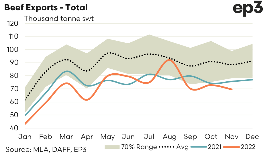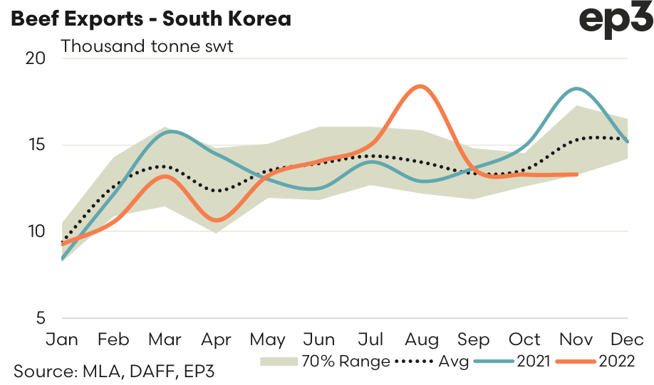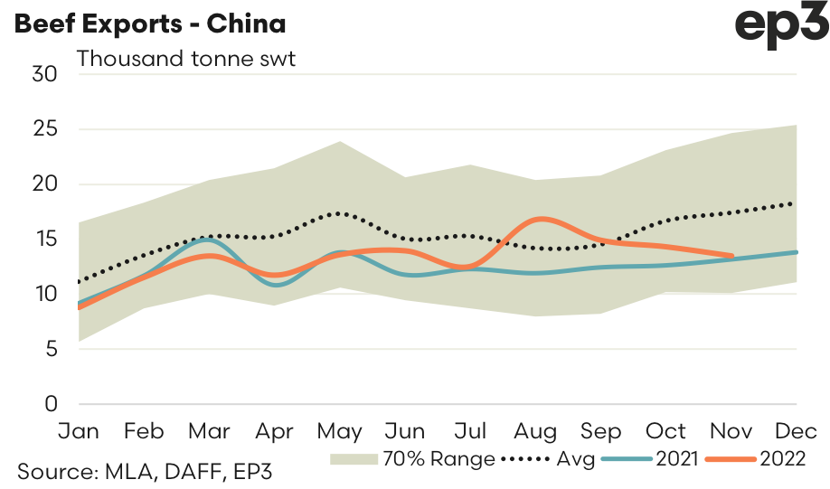 Australia’s second top destination for beef exports, China, saw an easing trend in demand over November with beef exports slipping 6% to see 13,487 tonnes traded. Beef exports from Australia to China in November now sit close to the levels seen in November 2021 and represent volumes that are 22% below the five=year average pattern for November.