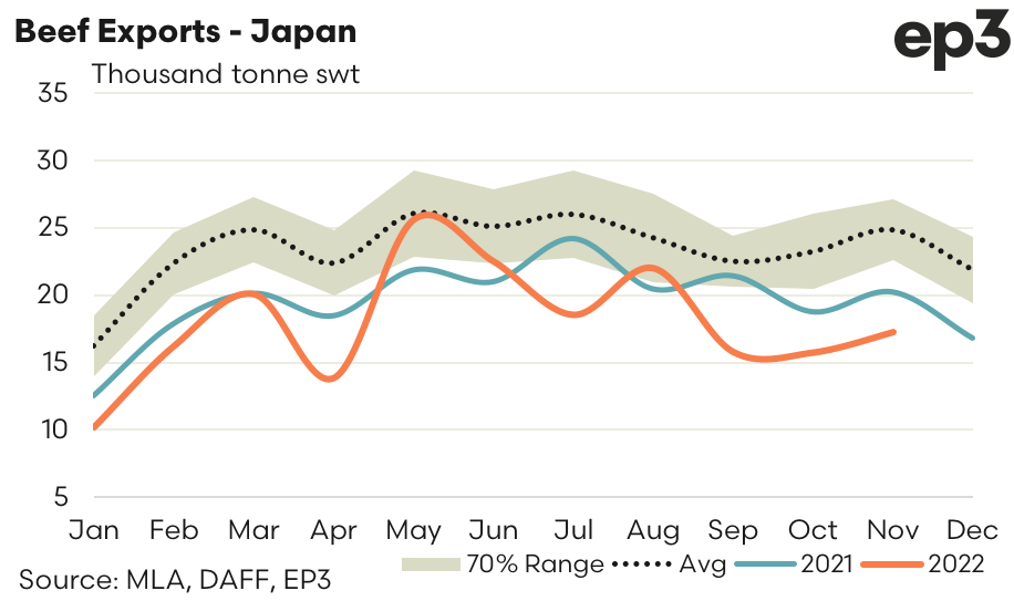 Japan, Australia’s top trade nation for beef exports, saw volumes lift nearly 10% over November, but they were coming up off a pretty low base. The 17,267 tonnes swt of Aussie beef exported to Japan in November represents less than 70% of the volumes that would normally be exported to Japan for this month in the year, based on the five-year average trend for November.