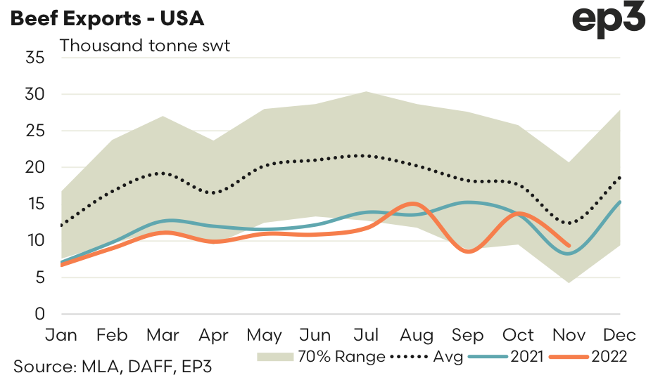 - Australian beef export volumes to the USA returned to the lacklustre performance it has been displaying throughout much of 2022 with beef exports declining by 32% over November.