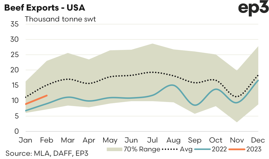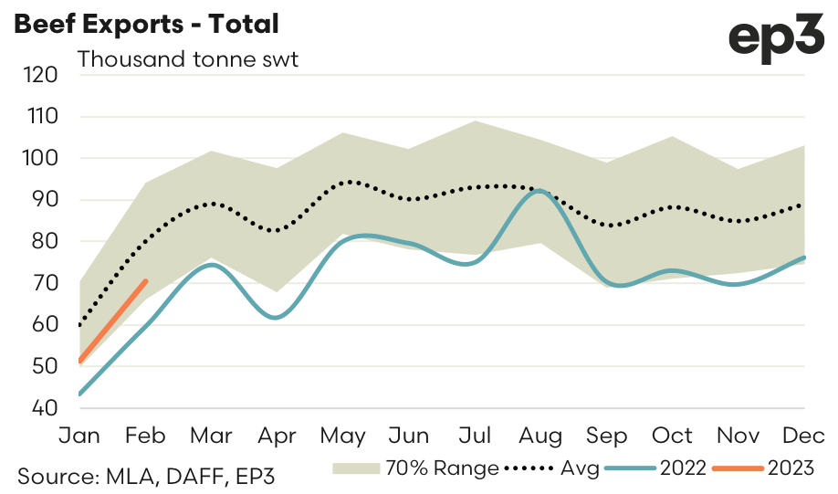 The trend in Aussie beef exports is still some way off the five-year seasonal average flows, but at least the 2023 season has begun in better fashion than what we saw in 2022. Total beef export flows for February lifted by nearly 37%, which is consistent with the gains your normally see from January to February, to hit 70,379 tonnes swt exported. This is the strongest February result since 2020 and represents flows that are 12% under the five-year average trend for February.