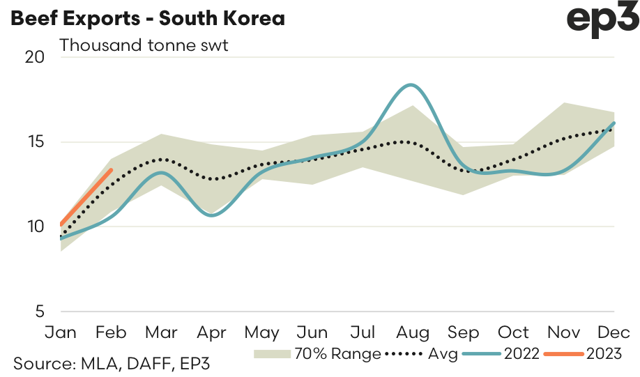 One shining light of optimism remains South Korea, the only top four destination that has reported above average beef export demand from Australia. South Korea has cemented second place as a top destination for Australian beef ahead of China, who sits in third place, accounting for 19.3% of total flows so far in 2023 compared to China’s 18.9% market share. South Korea saw almost a 32% increase in beef exports from Australia over February to hit 13,342 tonnes swt consigned, the strongest February flows since 2019, and representative of trade flows that are 7% above the five-year average pattern for February.