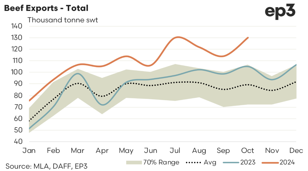 October 2024 has seen a new record volume set for total beef exports from Australia, outperforming the prior record set earlier in the year by just 50 tonnes. There was 130,048 tonnes swt of Aussie beef reported shipped offshore in October, a 14% gain on the volumes exported during September 2024. Compared to October 2023 the current flows are 24% higher and 45% stronger than the October average flows, based on the last five year of the beef export trade.