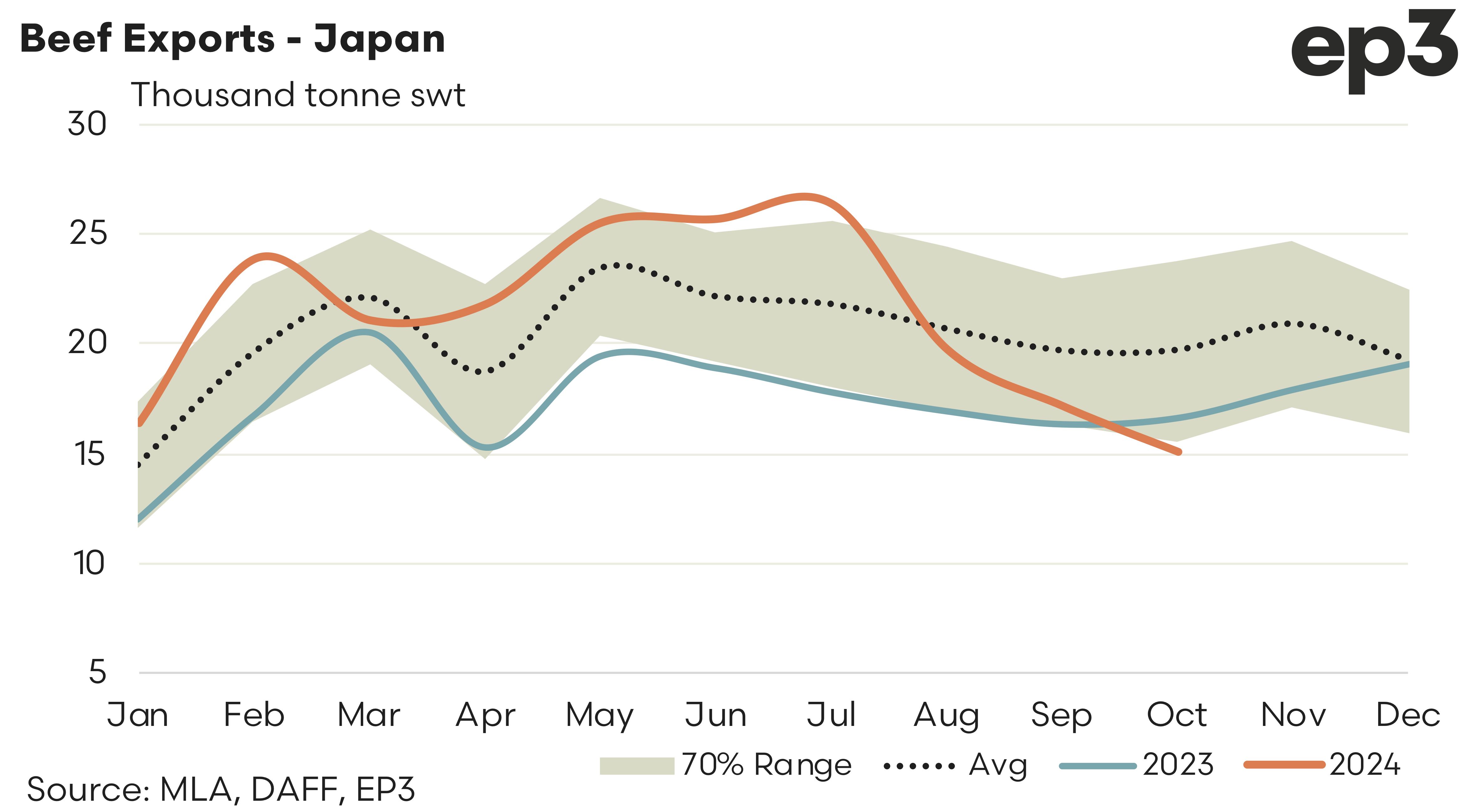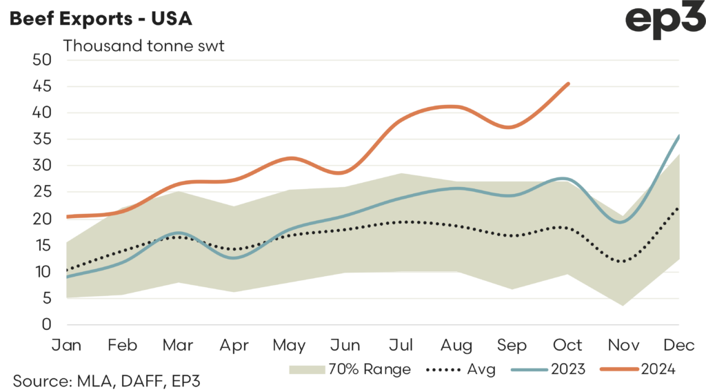 Japan – There has been a noticeable drop in beef demand from Japan into the second half of 2024 and October continues the softening trend seen since July. There was 15,021 tonnes of beef shipped out of Australia to Japan in October, a 12% easing on the September flows and it represents levels that are nearly 24% below the October average trade flows, based on the last five years of the Aussie beef trade to Japan.