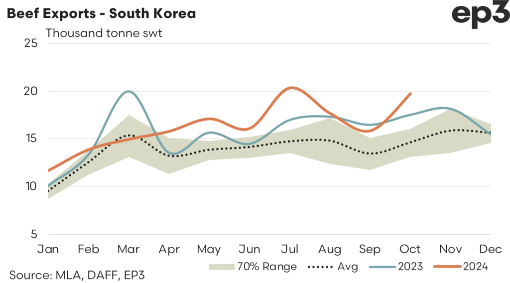 South Korea – October 2024 saw a 25% lift in demand for Aussie beef exports to South Korea with 19,733 tonnes reported exported. This is the fourth highest monthly beef volumes sent from Australia to South Korea on record and represents trade levels that are 35% higher than the five-year average flows for October.