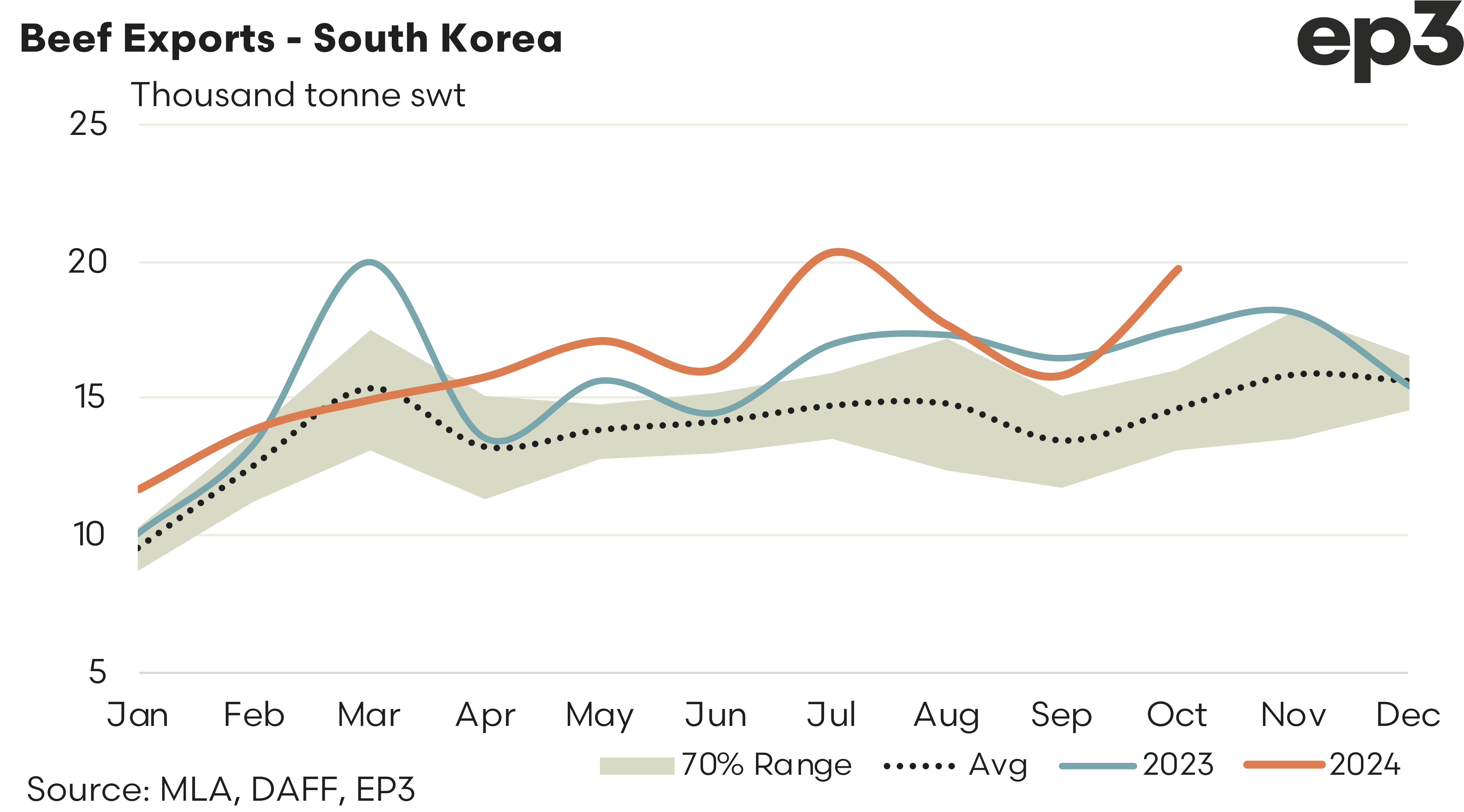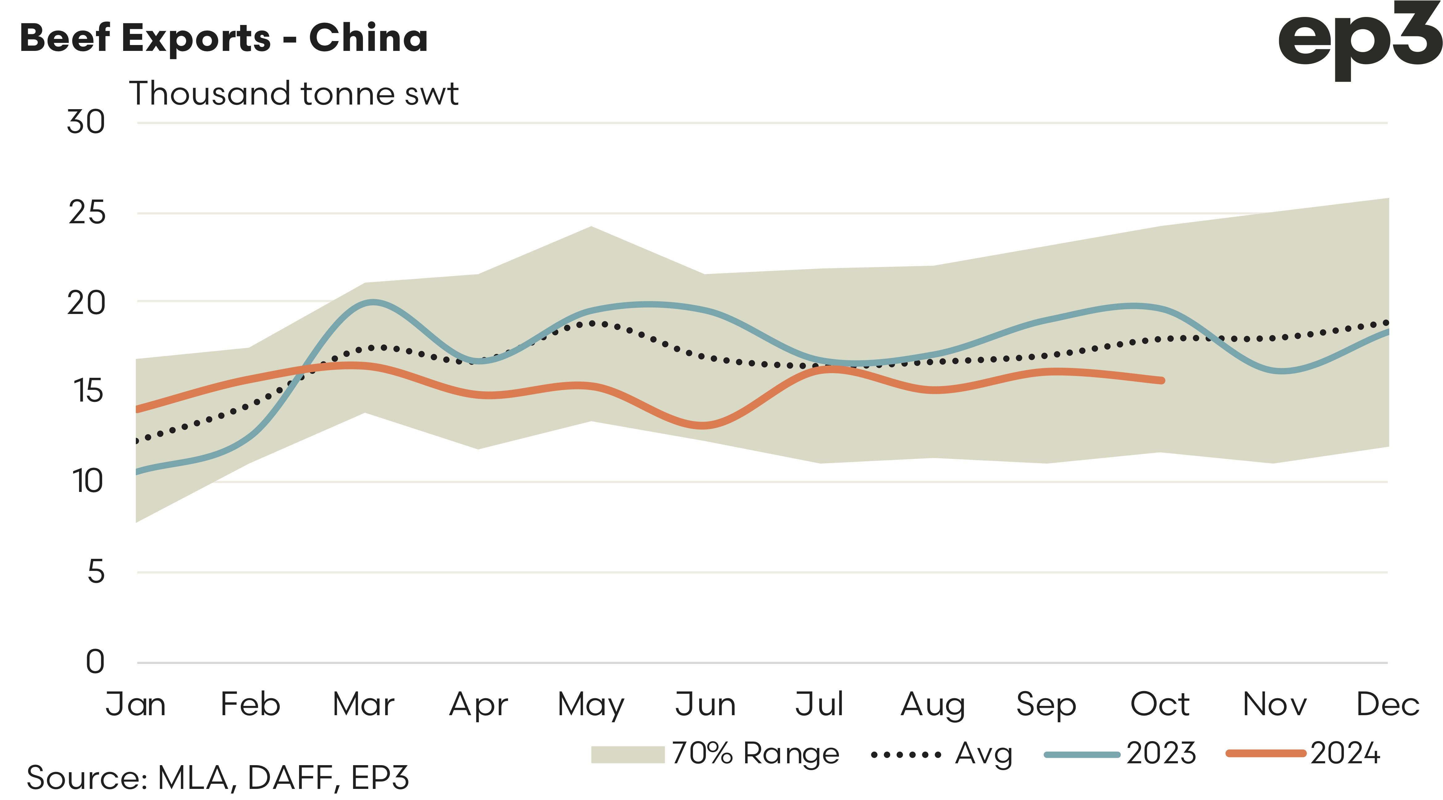 China – The beef trade to China continued to trend mostly sideways and remained below the average pattern, based on the last five-years seasonal trading levels each month. There was 15,678 tonnes of beef exported to China from Australia in October, which is a 3% easing from the levels seen in September 2024. Compared to the five-year average trend for October the current trade levels to China are running nearly 13% softer and reflective of a struggling Chinese economy and low levels of Chinese consumer confidence.