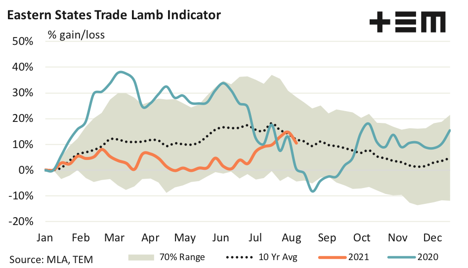 The ten-year average seasonal pattern for the ESTLI gain/loss highlights that the market often peaks in late July/early August, reaching a low ebb in November as the large volumes of Victorian spring lambs hit the market.