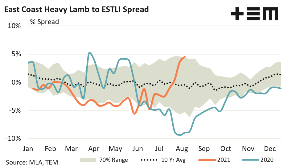 The behaviour of the heavy lamb spread to the ESTLI is in stark contrast to the situation last season when Covid-19 disruptions to Victorian abattoirs, with government workforce constraints enforcing a 65% capacity restriction, pushing the heavy lamb spread from a 5% premium in Jun 2020 to a very unseasonal 9% discount in August 2020.