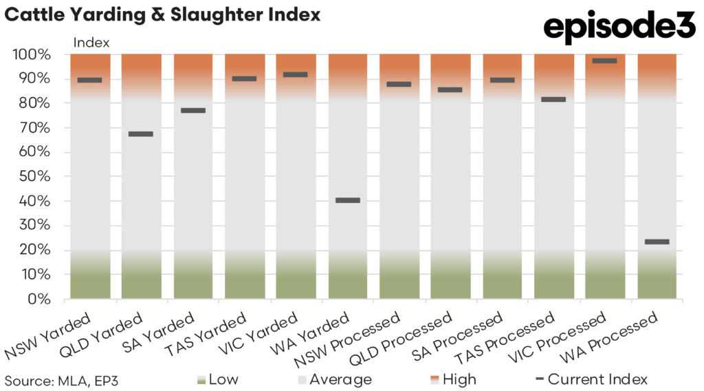 In contrast, southern producers, facing dry pasture conditions, continued to turn off cattle at pace. Victoria and South Australia’s resilience during this period underpinned national kill volumes. However, this accelerated southern supply is now testing processor capacity, particularly as Queensland throughput resumes. Some southern plants are experiencing backlogs, and lighter carcase weights due to declining pasture quality may begin to affect yields and margins.