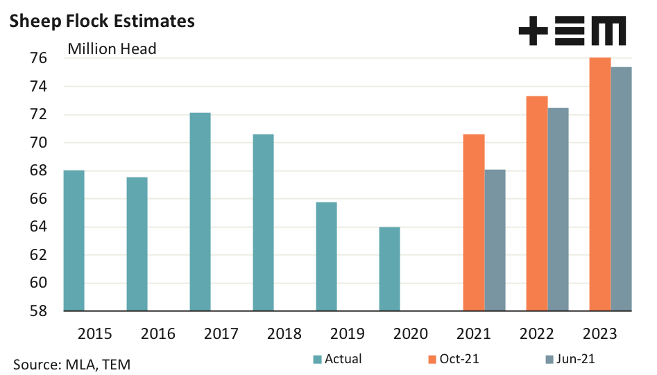 - The national sheep flock has been revised up to 70.6 million head for 2021, this is a 3.7% gain on the flock forecast from the June projections.