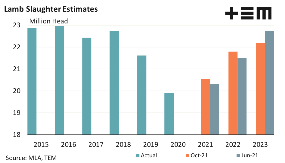 MLA now expect sheep slaughter to come in at 5.1 million head for 2021, down 16.4% on their June estimate. Further revisions down are seen in 2022 and 2023. Sheep slaughter in 2022 is expected to come in at 5.8 million head, 18.3% below the mid-year projections. The 2023 sheep slaughter is forecast to be 8.1% softer than originally thought, coming in at 7.4 million head.