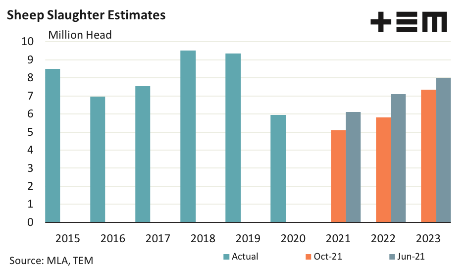 - MLA now expect sheep slaughter to come in at 5.1 million head for 2021, down 16.4% on their June estimate.
