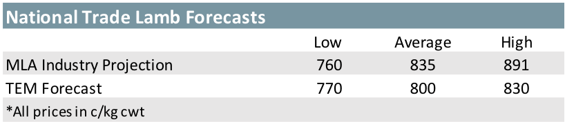 The market is forecasting the NTLI to decline around 10% from current levels to finish at 835c/kg cwt at the end of December 2021. Although the possible range according to the six participating analysis firms that provided their projections to MLA indicate that the NTLI could finish between 891c and 760c.
