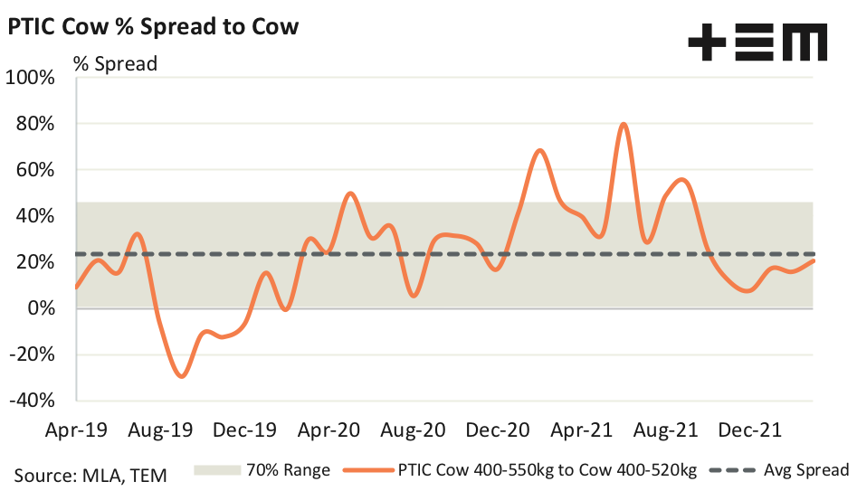 Analysis of the percentage spread premium/discount of PTIC Cows 400-550kg to Cows 400-520kg shows that over the last few years PTIC Cows have averaged a premium of 24%, and a normal range in spread fluctuation between a 1% premium to a 46% premium. The March average price of $2,291 per head for PTIC Cows places the current premium spread to Cows at 21%, suggesting PTIC Cow prices are at relatively fair value compared to Cow prices.
