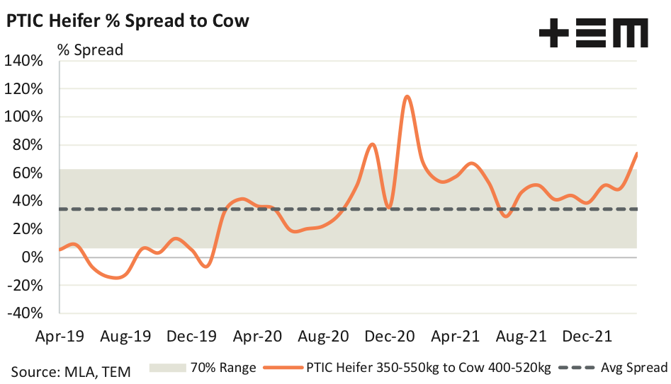The recent surge in PTIC Heifer (350-550 kg) prices to $3,300 per head have widened the premium spread they hold to Cows (400-420kg) to 74%. Historically, PTIC Heifers have maintained an average premium spread to Cows of 34%, with a normal spread range between a 6% premium to a 63% premium, so PTIC Heifers at these price levels are becoming a little overvalued compared to Cow prices. Although the spread premium is nowhere near the peaks toward 115% seen during early 2021.