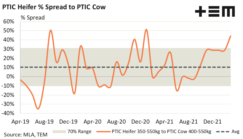 - The spread premium PTIC Heifers hold over PTIC Cows has increased to 44%, just shy of the historic peaks seen of around 50%.