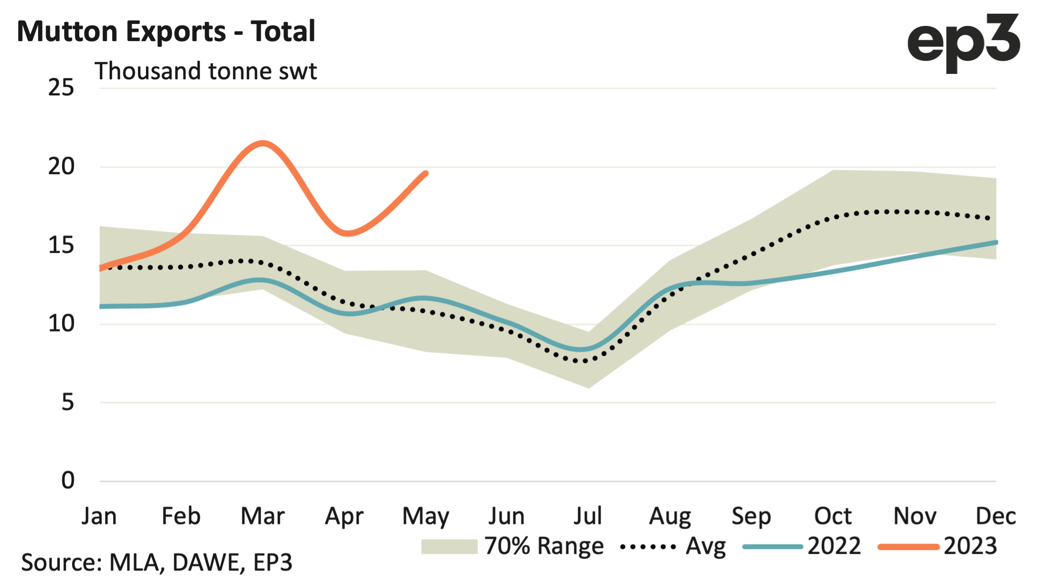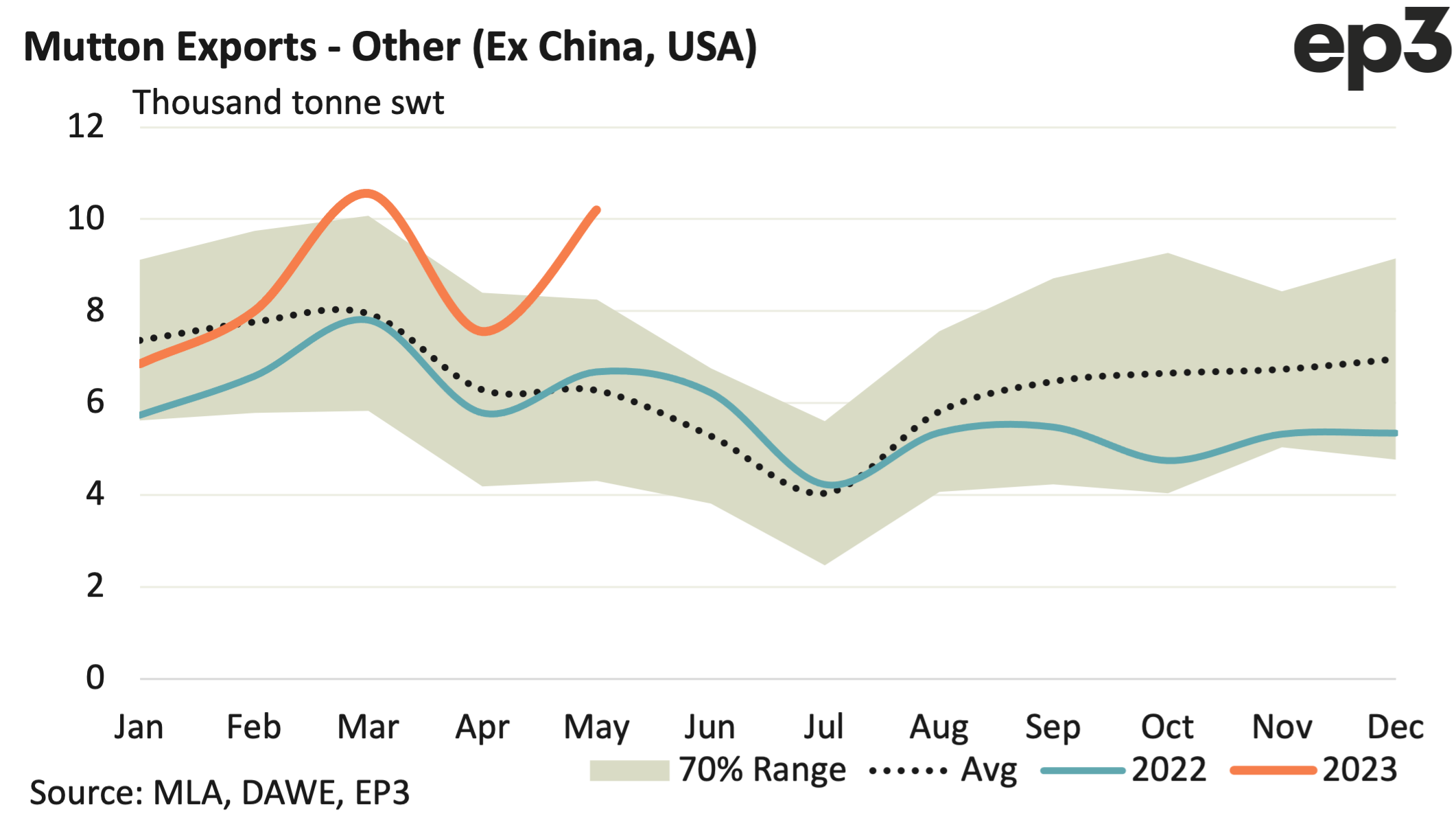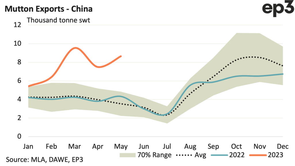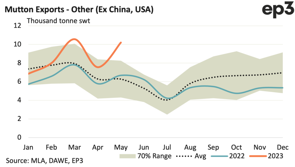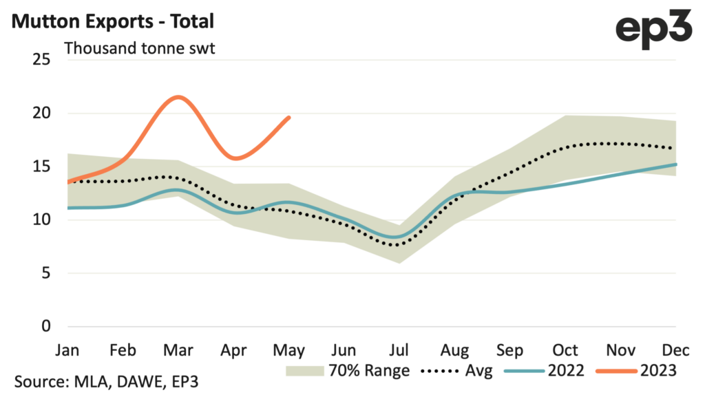 Since the start of 2023 average monthly mutton exports have been around 17,200 tonnes compared to the 12,700 per month, on average, we have seen over the last five years during the Jan to May period. This represents around 35% higher demand for mutton this year compared to the five-year trend.