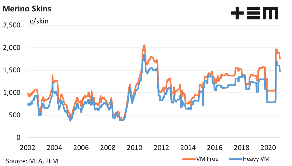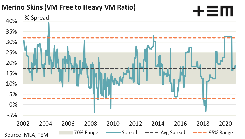 Currently the premium spread of VM free Merino skins to heavy VM skins sits marginally above the long-term average at around a 19% premium.