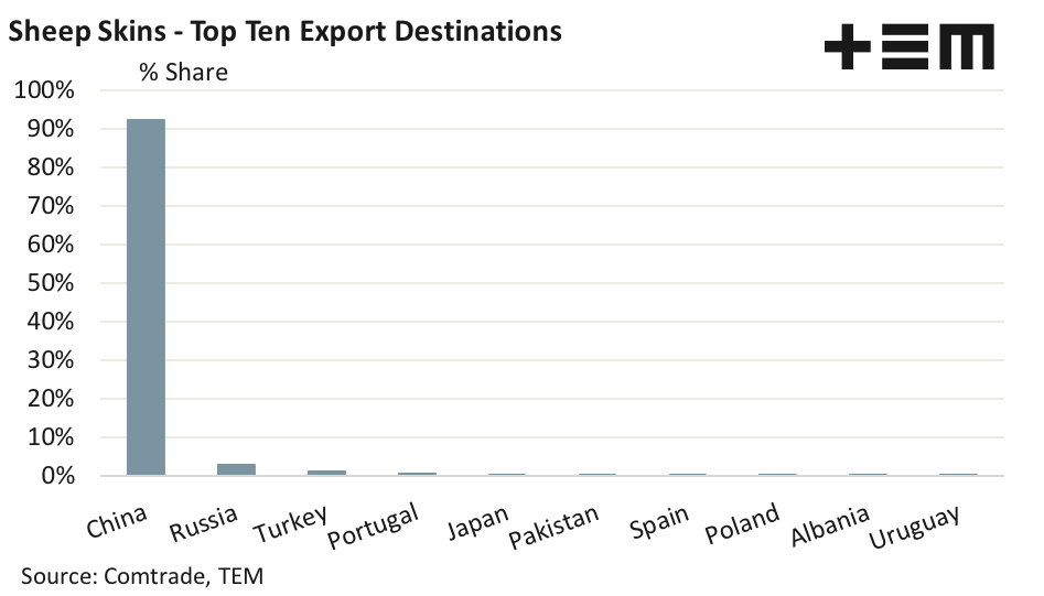 - China dominates the purchase of Australian sheepskins with more than 90% of the trade flows.
