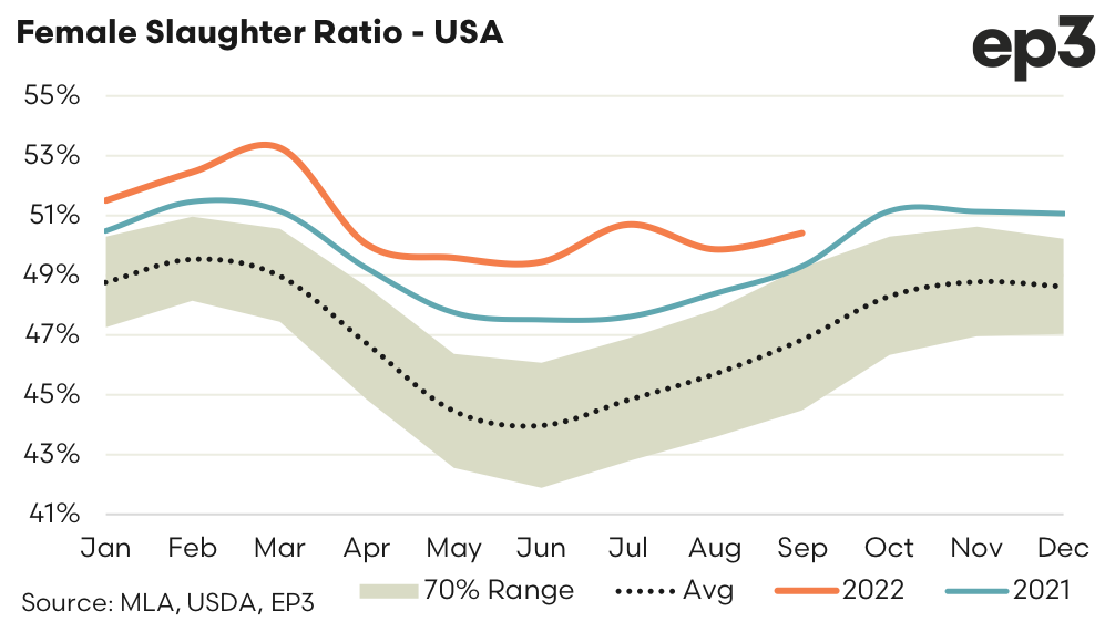 Currently, in 2022 the annual FSR in the USA is at 50.8% (as at the end of Sept) which is the second highest this ratio has been on an annual basis since records began in 1986. In 1986 the annual average FSR in the USA was 51.1% and that year the US herd declined by 3.8%.