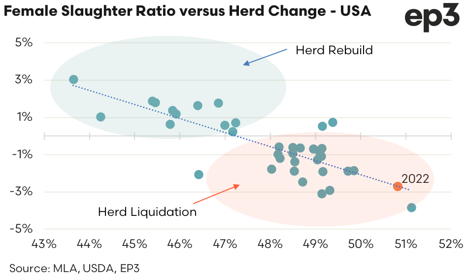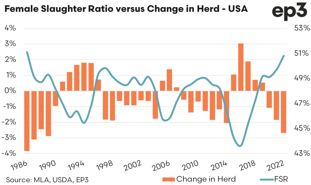 A comparison of the annual FSR to the annual herd change in the USA shows that and FSR nearer to 51% would be consistent with a decline in the herd of around 2.5% to 3%. The United States Department of Agriculture (USDA) herd census shows that from 2021 to 2022 the herd declined 2% from 101 million head to 98.8 million head, as at July 2022.