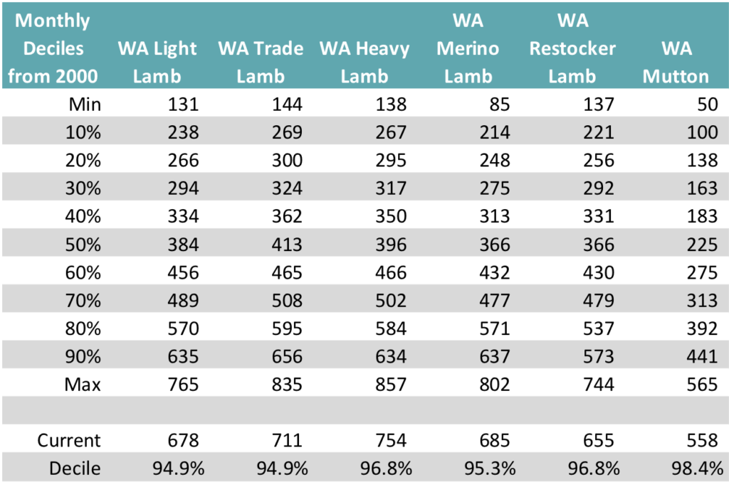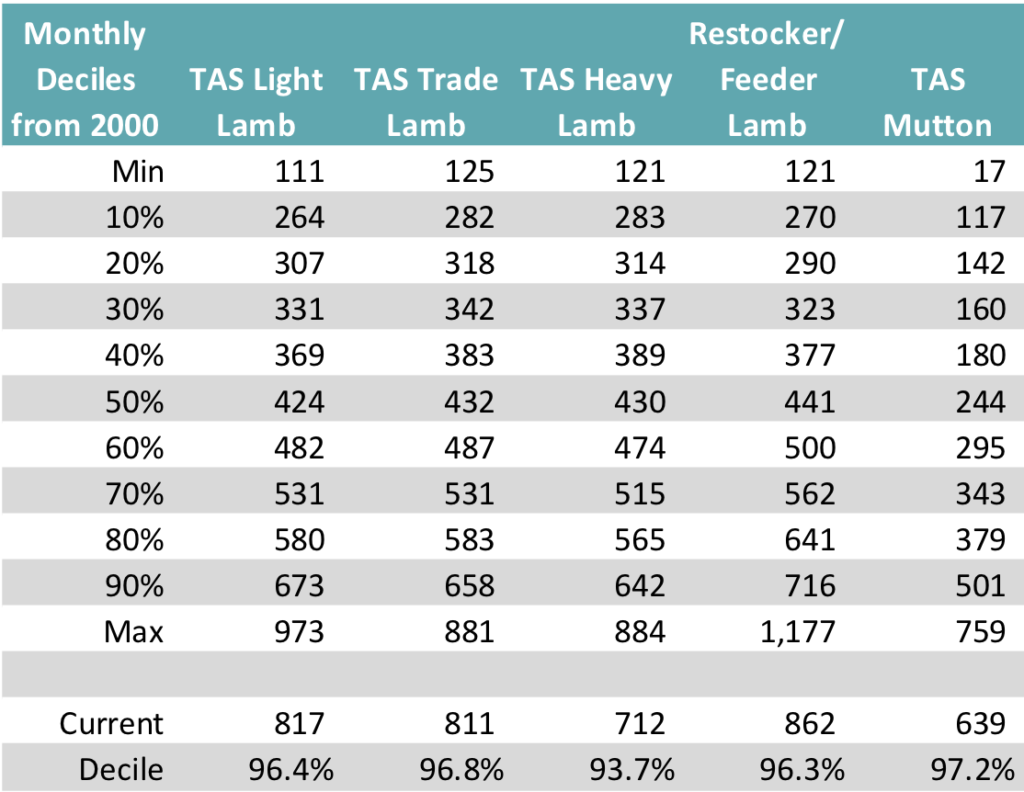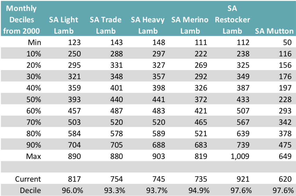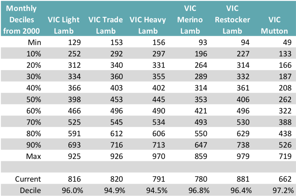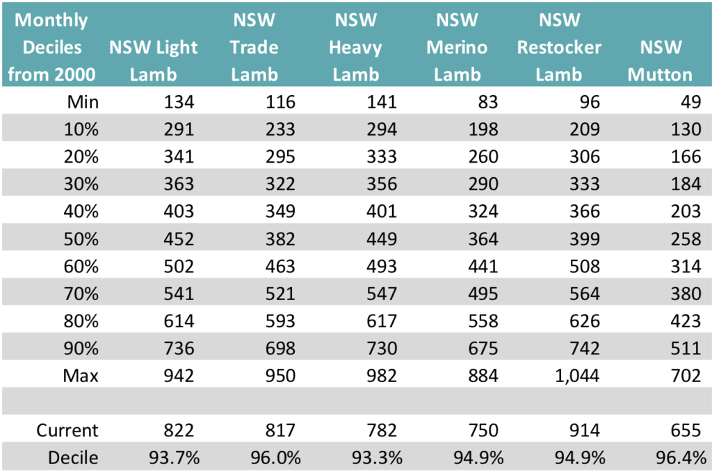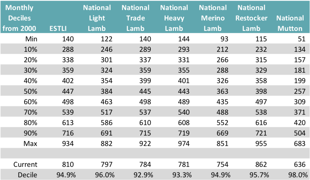 Deciles for the sheep and lamb markets remain above the 90th percentile with the favourable season and strong intent to rebuild the flock continuing to see robust decile levels for restocker lambs and mutton across most states.
