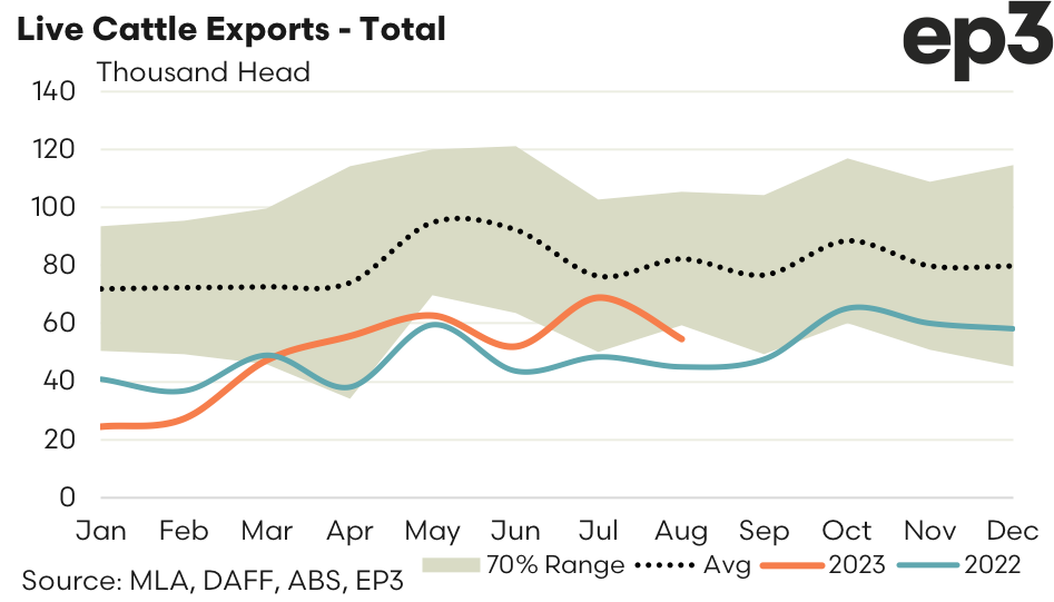 Total live cattle exports eased by 21% during August 2023 to see just 54,560 head transported offshore from Australia. This represents levels that are nearly 34% under the five-year average seasonal pattern for this time in the year. Normally total flows in August would be nearer to 84,000 head, based upon the average levels seen exported in August over the last five years.
