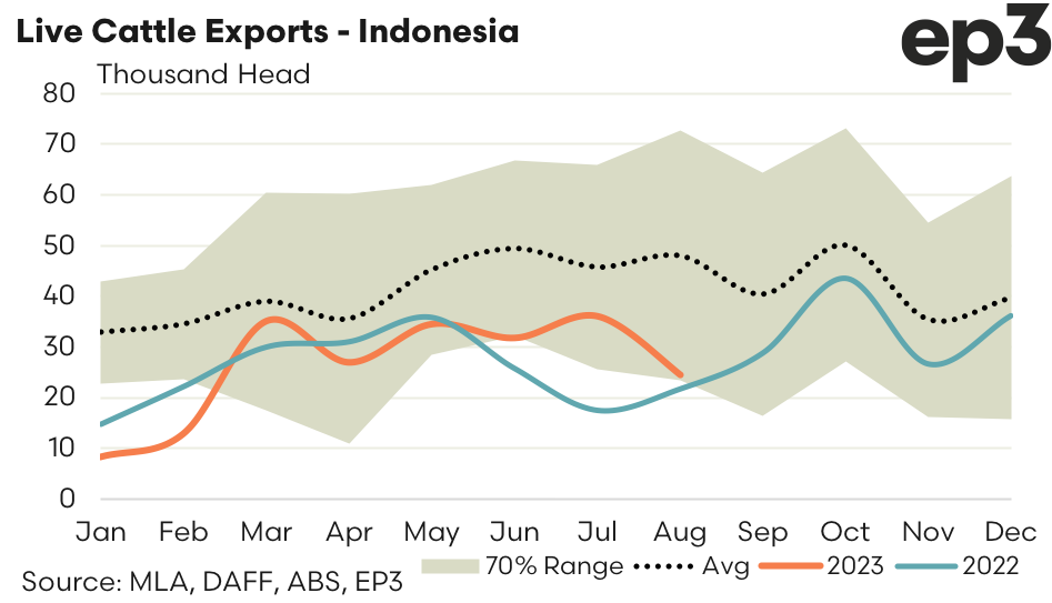 Indonesia – Bans on several export facilities in Australia (which has now been lifted) restricted the volume cattle exported to Indonesia over August. There was 24,470 head sent to Indonesia over August 2023 which is a 32% decrease on the volumes seen during July. Compared to the five-year average flows for August, current export volumes are 49% below the average seasonal trend.