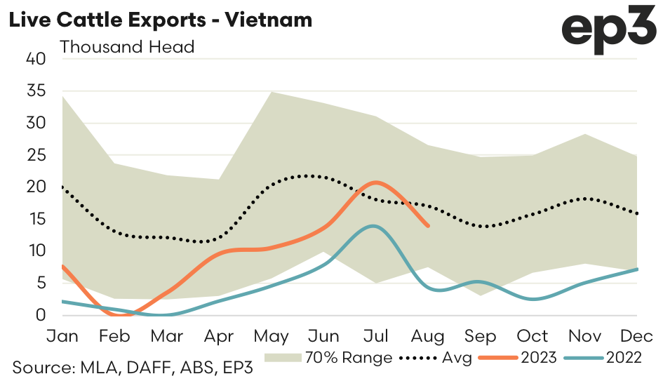 Vietnam – After an improved July Australian live cattle exports to Vietnam slipped again, declining by 32% during August to see just 13,947 head shipped. This places current trade volumes from Australia to Vietnam back under the average pattern by 18%.