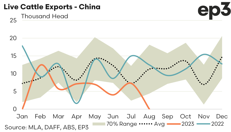 China – There were no flows reported to China over August. Since January 2023 to August 2023 the average monthly flow of cattle from Australia to China sits at 5,456 head which is 46% under the five-year average seasonal trend and 52% lower than the levels seen for the same time last year.