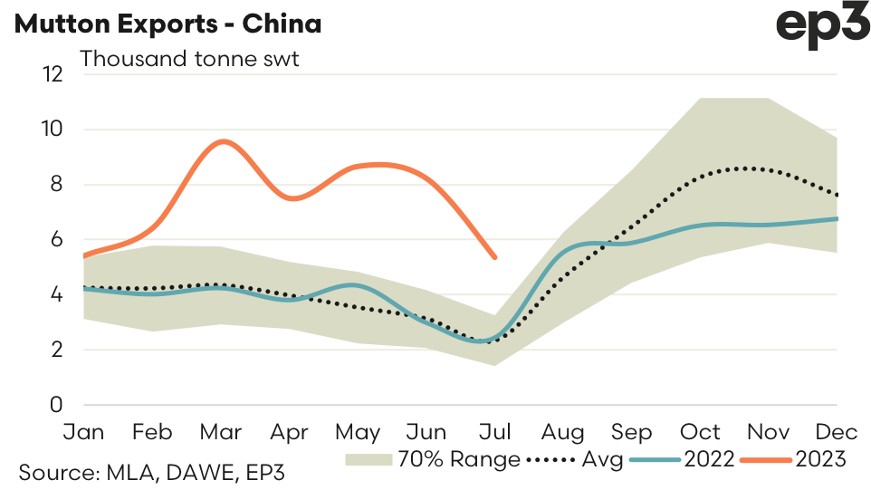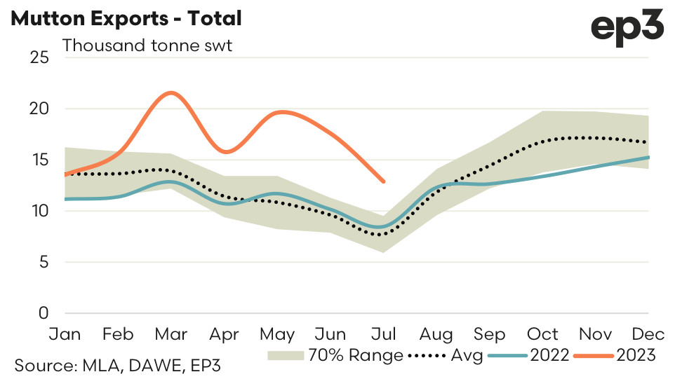 So while mutton exports to China are down, it is also still ridding pretty high for this time in the season. Additionally, the July 2023 trade volumes are the strongest July mutton export figures from Australia to China on record. Interestingly, the stronger part of the season, in terms of Chinese mutton demand, usually occurs toward the final quarter in the year and if that normal trend plays out we may be in for some huge trading months from October to December – time will tell.