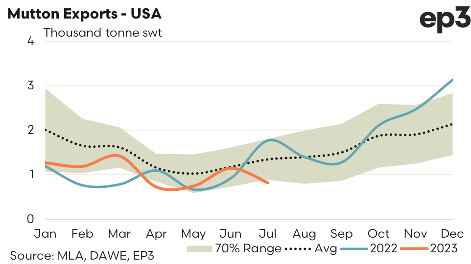 Malaysia has been the second top destination for Australian mutton exports in 2023 and while they too saw a drop in demand over July of 24%, to 1,249 tonnes swt, this still represents levels that are 28% higher than the five-year average for July. The USA now sits in third top place, in terms of market share of total Aussie mutton exports, pushed a peg lower by Malaysia during this year. July 2023 saw mutton exports to the USA decline by nearly 29% to record just 815 tonnes exported. Compared to the five-year average volumes for July this is 39% under the normal seasonal trend.