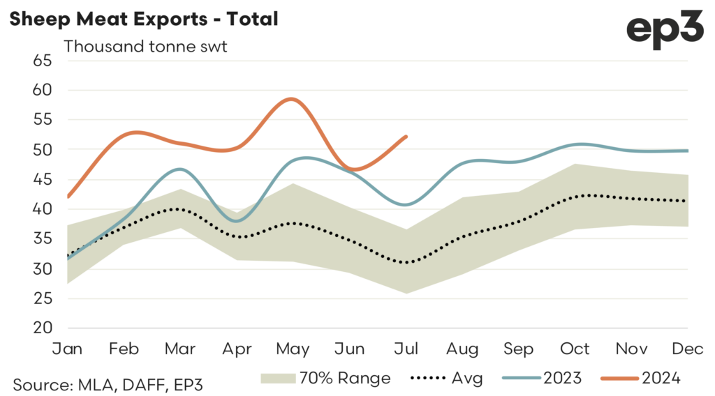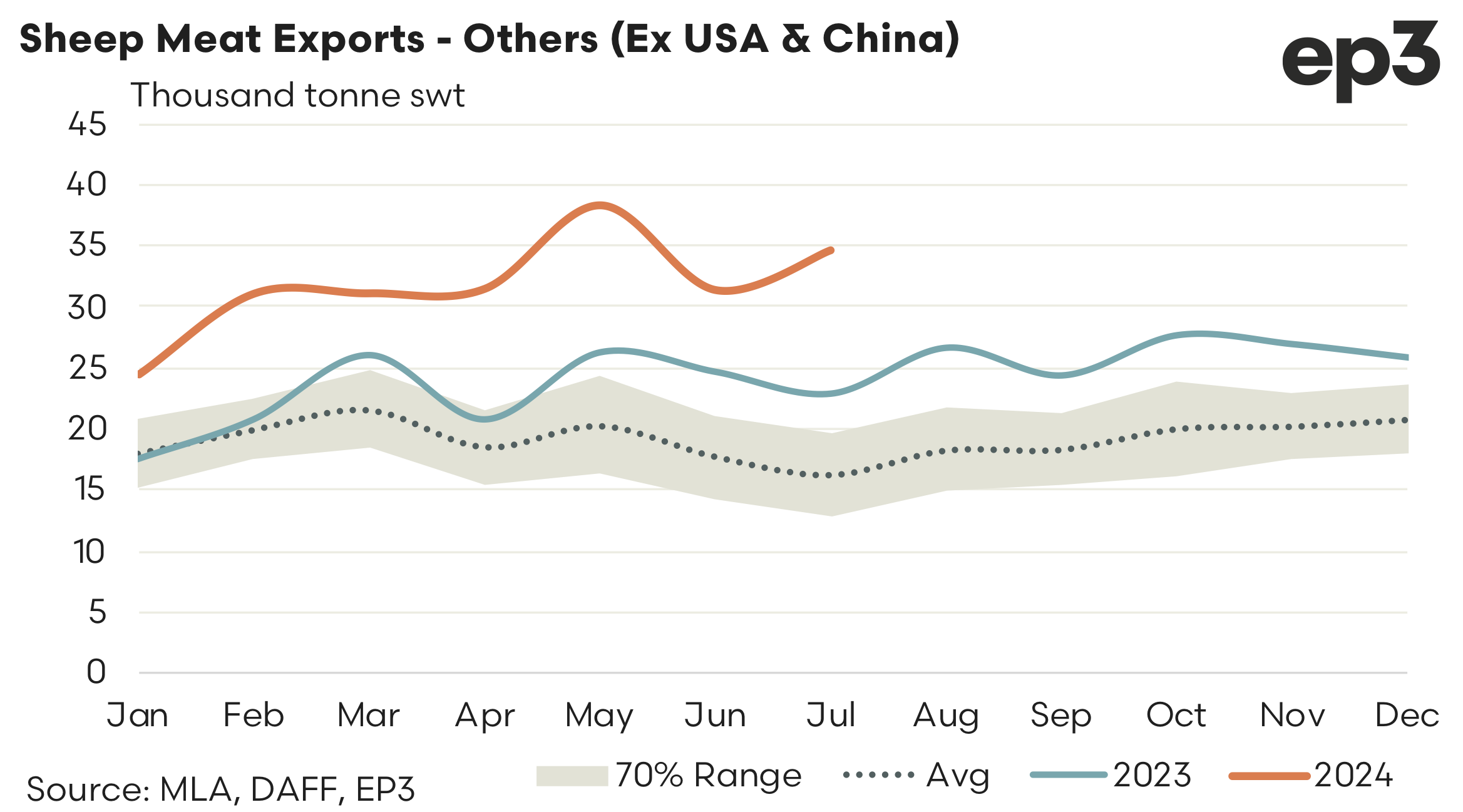 The Others – The trade flows of Aussie sheep meat to all of the “other destinations” (excluding the USA & China) remained strong too. During July 2024 there was 34,703 tonnes exported to these other regions. This represents trade volumes that are 113% above the five-year average volumes for July and nearly 52% higher than the levels seen exported during July last year.