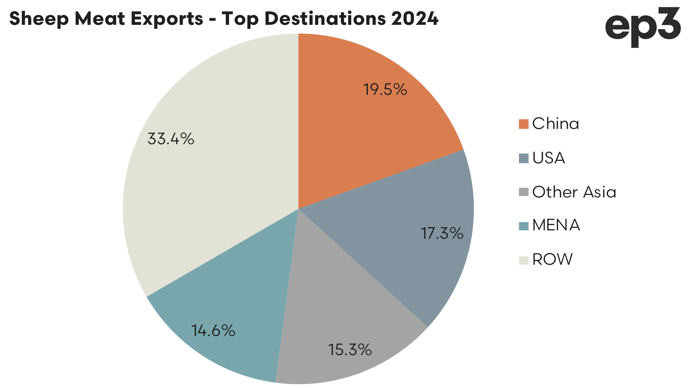 Key export destinations are relatively evenly distributed in terms of market share of sheep meat export volumes. China holds the top trade spot at 19.5% of total sheep meat export flows for 2024. The USA sits in second place on 17.3% of the trade and “other Asian” destinations is battling the Middle East & North African region (MENA) for third spot on 15.3% and 14.6%, respectively.