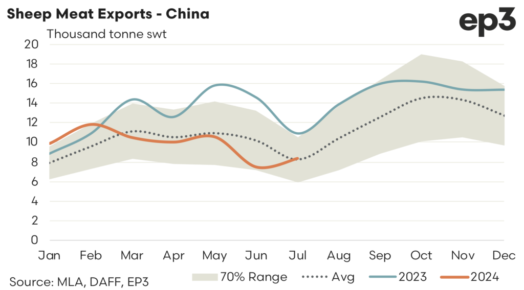 China – Aussie sheep meat flows to China lifted by nearly 12% during July 2024 to see 8,391 tonnes traded. This is 23% below the volumes exported in July 2023 but it it the first time since February 2024 that monthly sheep meat exports to China moved above the seasonal average trend, based on the last five years of the trade. Current July flows to China sit nearly 2% higher that the July average trend.