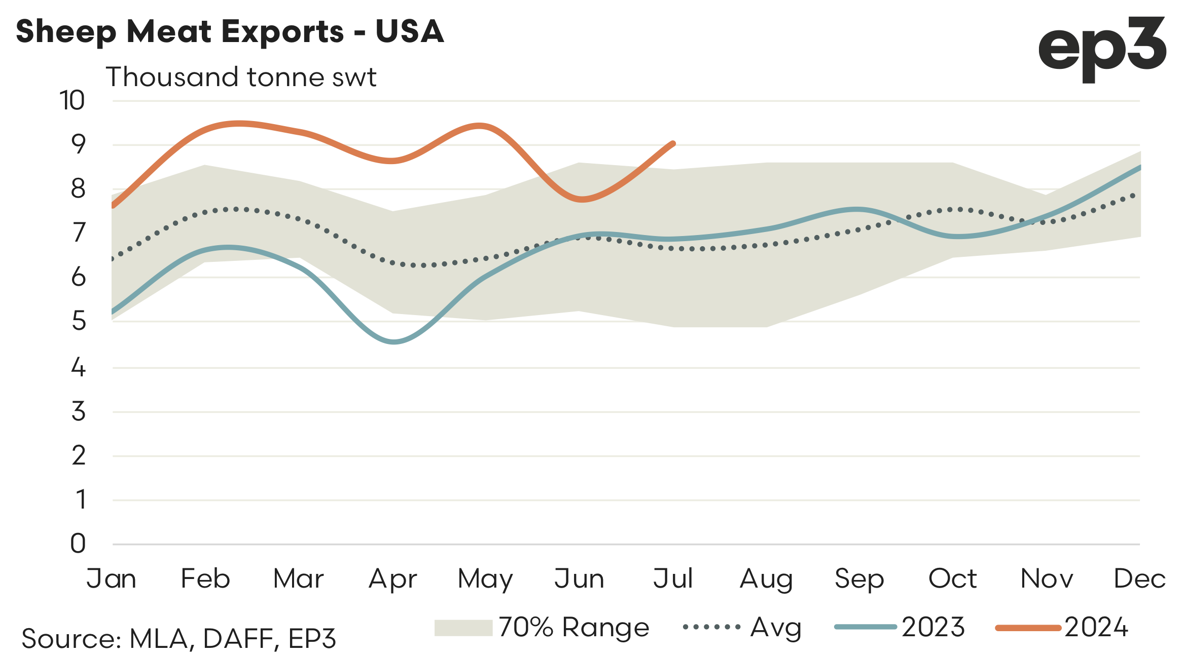 USA – American demand for Aussie sheep meat continues to demonstrate a robust trend with volumes during July 2024 running 35% above the five-year seasonal average for July. There was 9,015 tonnes swt shipped to the USA during July, which represents trade levels that are 31% higher than July 2023 and a 16% gain on the export volumes seen during June 2024.