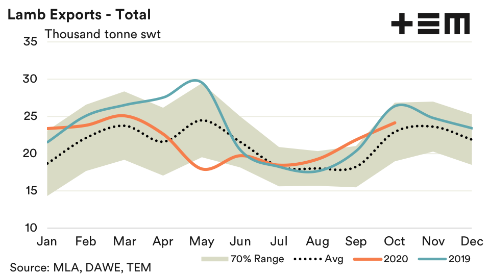 - October lamb exports are 11% above the five-year seasonal trend at just over 24,000 tonne shipped weight.