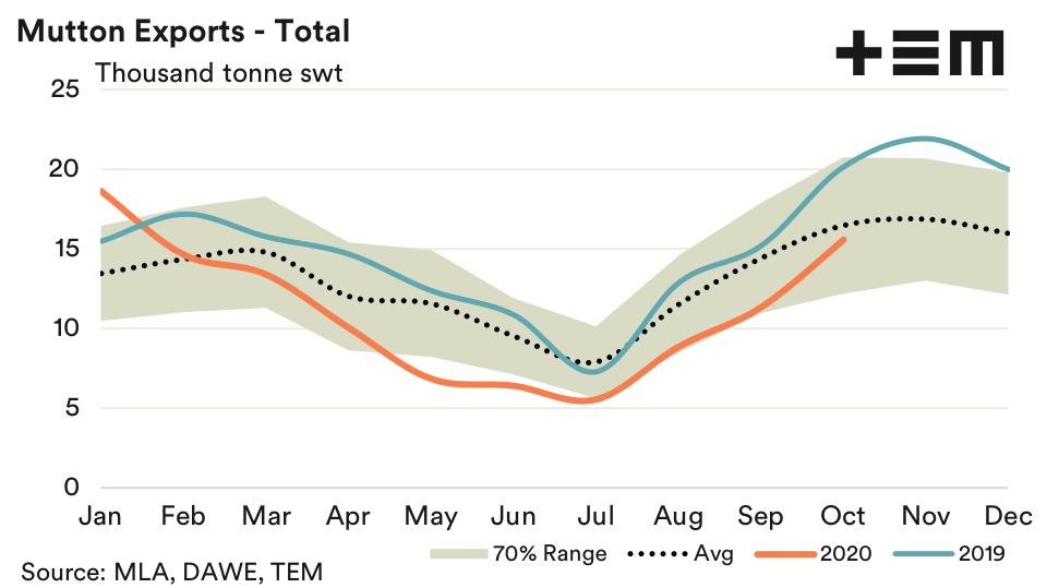 Total mutton export volumes for October are running at 15,590 tonnes swt, just 7% under the five-year average trend for this time in the year.