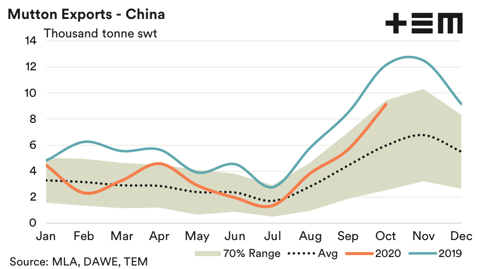 - Exports of mutton have continued to recover with October trade levels just 7% under the five-year trend.