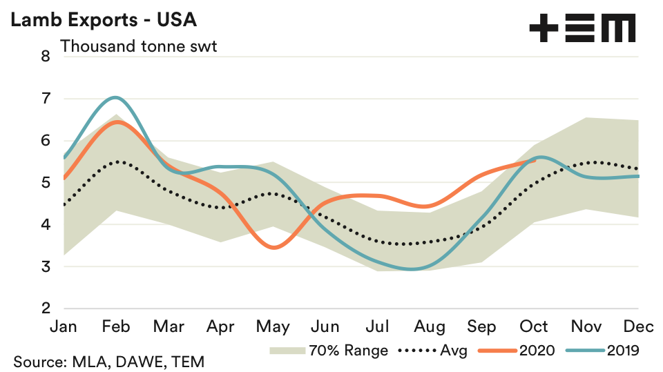 Most of the key destinations for Australian lamb product are ahead of their respective average trend for October, signalling good diverse offshore demand presently. However, demand from the USA is particularly healthy sitting 11% above the five-year average pattern.
