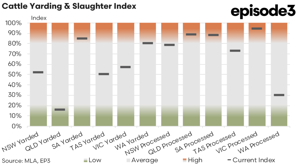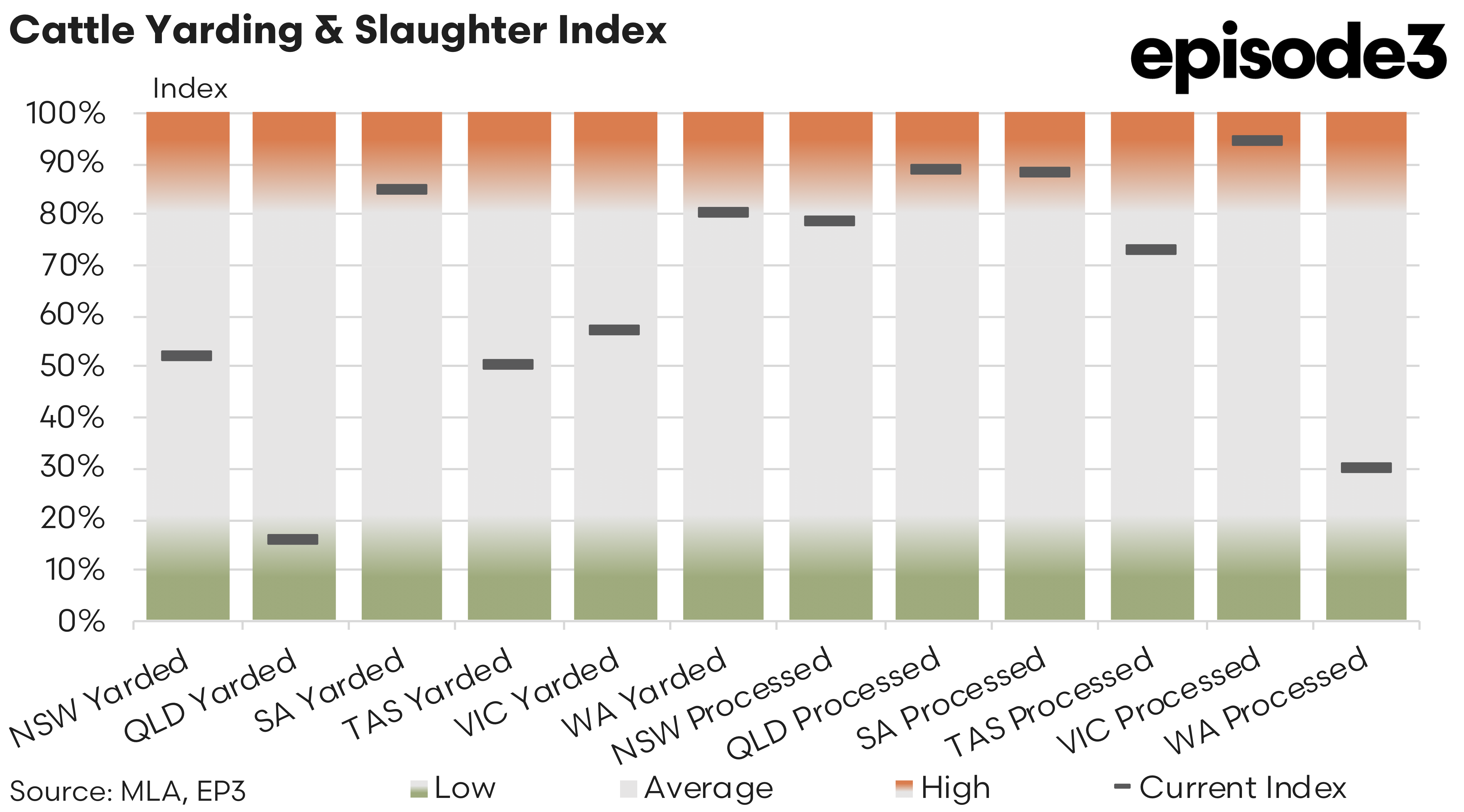 Victoria demonstrated a yarding index of 57% and an exceptionally high processing index of 94%. This indicates strong cattle supply and processing activity, making it a key region for Queensland processors seeking additional cattle to meet their high slaughter rates.