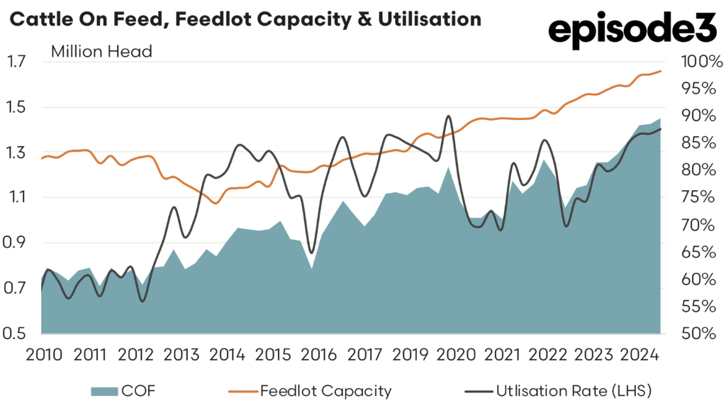 In terms of capacity in feedlots nationally the amount of available space grew by nearly 1% to hit 1.66 million head, which saw the national feedlot utilisation ratio move from 86.7% to 87.5%. Currently Queensland holds to most cattle on feed with a share of 58% followed by NSW on 29%. Meanwhile, Victorian, South Australian and Western Australian feedlots hold about 4-5% apiece.