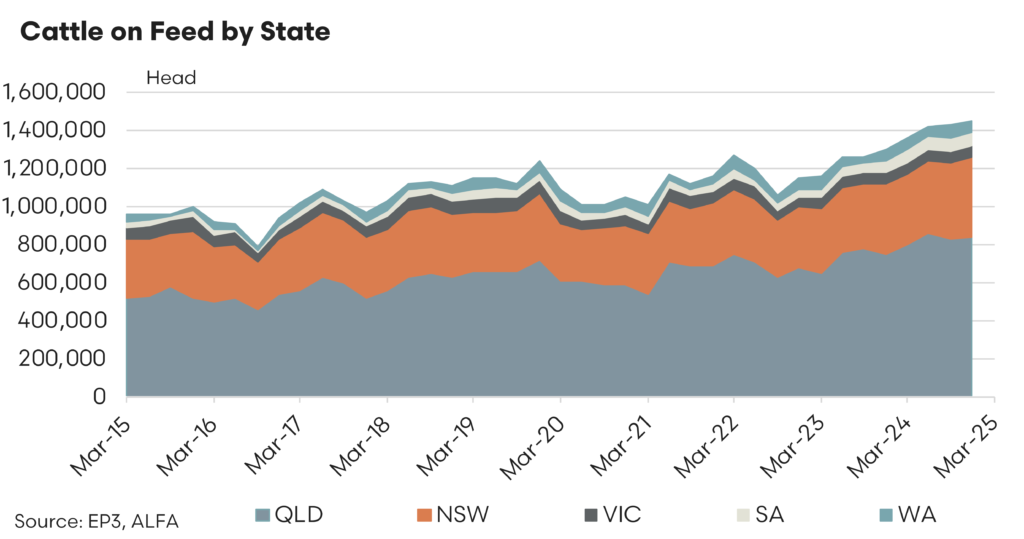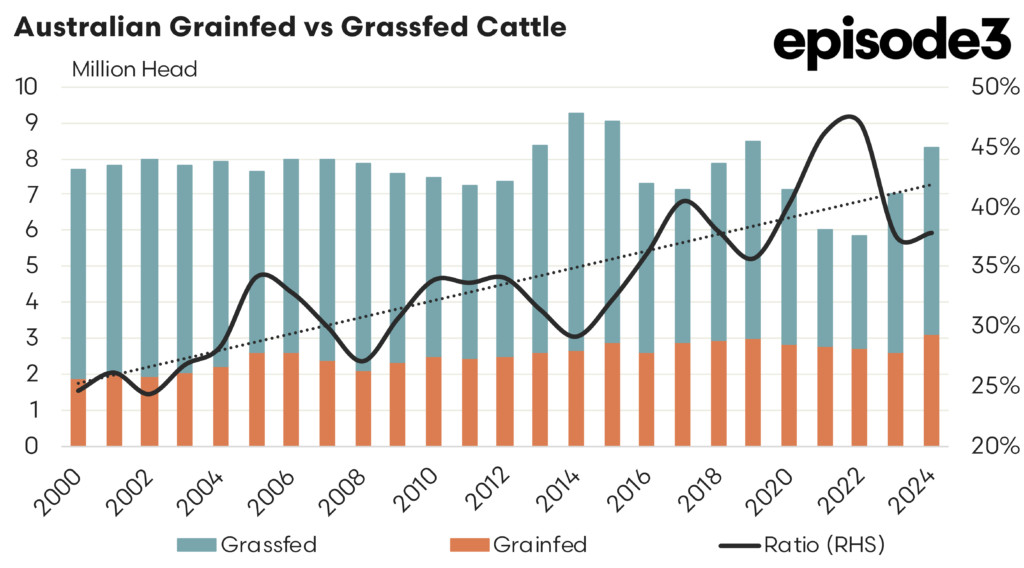 Breaking down the cattle on feed numbers for long fed cattle (mostly Wagyu) there was a big lift in 2024 for cattle on feed for more than 300 days reaching over 300,000 head for the first time on record during 2024. The last time we saw a big lift in these long fed cattle numbers was during the 2018 season when a large lift in F1 Wagyu numbers were noted, leading to a phase of price pressure until the strong supply was worked through.