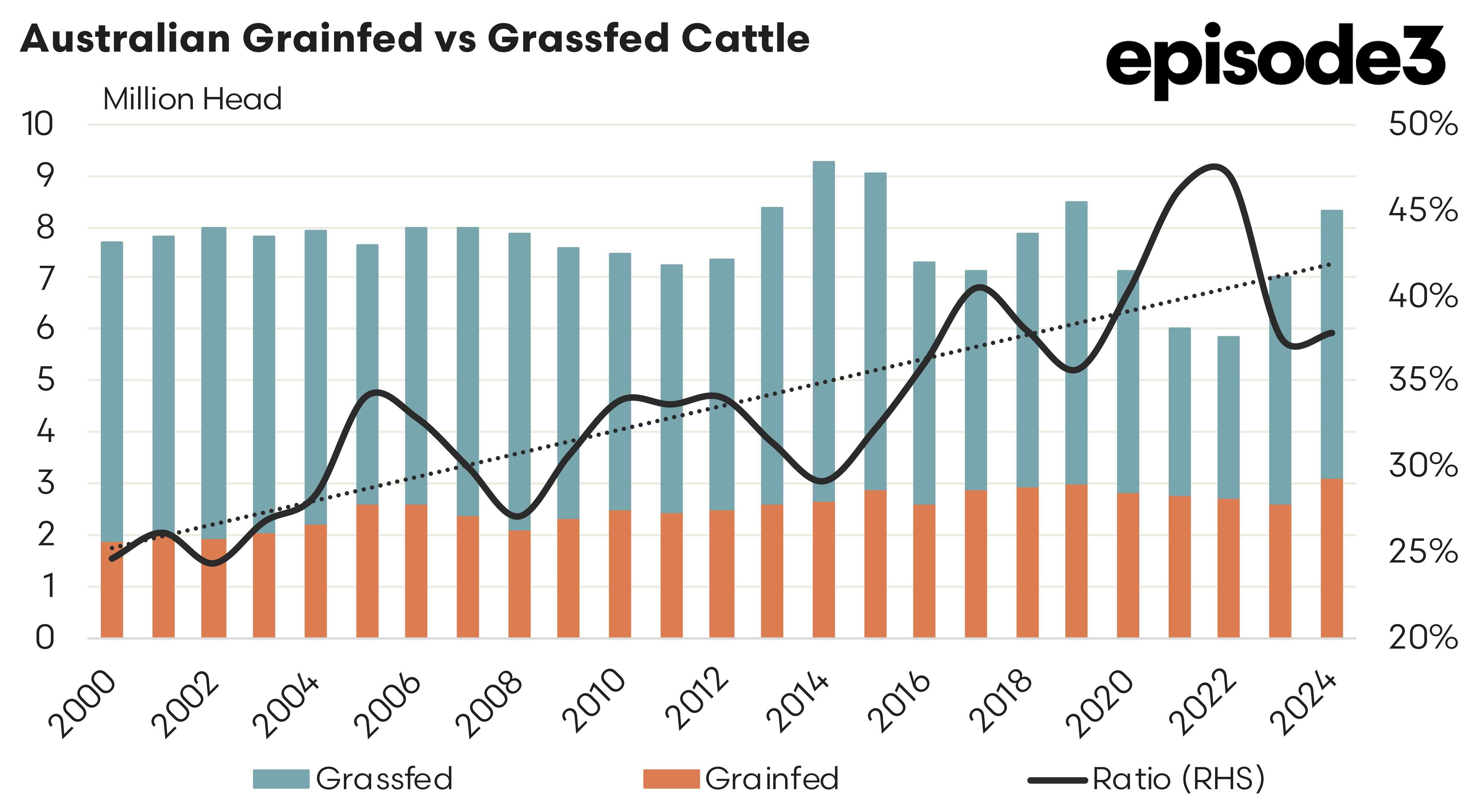 As the end of year numbers are now in we can compare grain fed slaughter numbers versus grass finished cattle. In 2024 there was 37.8% of cattle that were turned off that were grain finished. In number of head this was 3,140,026 head grain finished versus 5,163,874 head of cattle that were grass finished. The grainfed ratio was slightly up in 2024 from the 37.5% seen in 2023, but still well down on the peak grain fed ratio of 46.9% seen in 2022.