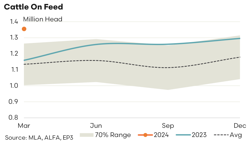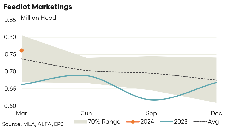 In terms of seasonal differences, the COF number for Q1 2024 has started the season 17% higher than the first quarter of 2023 reflecting a positive outlook for the sector in the coming season. Compared to the five-year trend the Q1 cattle on feed numbers for 2024 are sitting nearly 20% higher. The increased feedlot volumes are filtering through to much higher marketings for Q1 2024 with 761,550 head of cattle turned off for the March quarter. This is an increase of 14% from the turnoff levels seen during the final quarter of 2023 and 15% higher than the turnoff seen in Q1 2023. It is also 3% higher than the average Q1 marketing levels based on the last five-years of data.