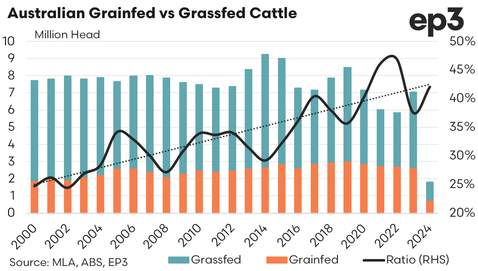In terms of total cattle slaughter for Q1 2024, there have been 1,811,300 head of cattle processed of which 761,550 have been finished on grain. This leaves 1,049,750 head of turned off that were grass finished. This increased grainfed turnoff has lifted the ratio of grain to grass finished cattle from 37.5% in 2023 to 42%, so far in 2024 and places the grainfed ratio back in line with the long term growth trend for feedlot versus grassfed turnoff since the early 2000s.