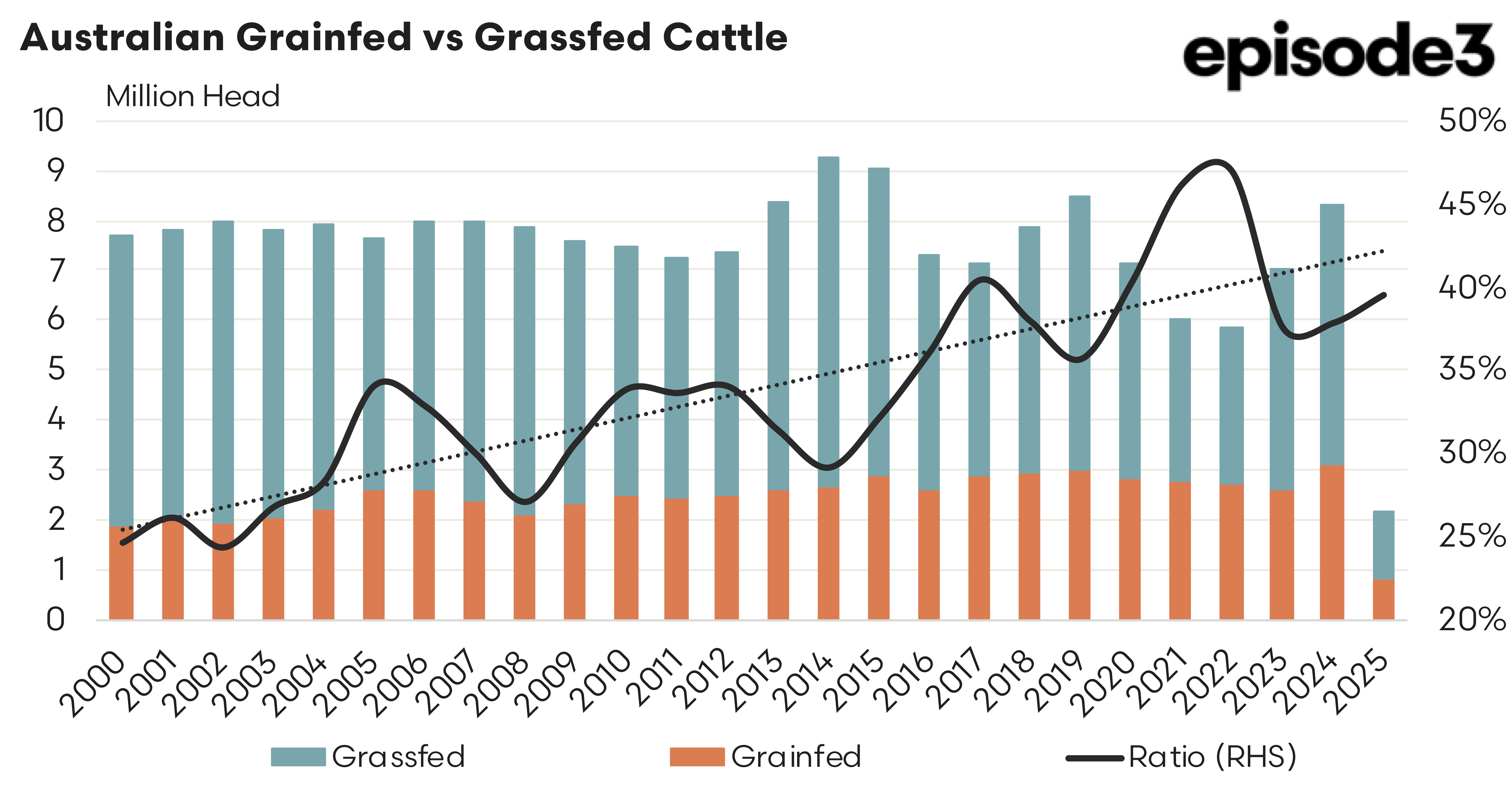 Comparing Q1 turnoff for grain finished versus grass finished cattle the ratio of grainfed has lifted from 37.9% in 2024 to 39.5% in 2025. Historically the grainfed ratio lifts as we enter into herd rebuild phases and the trend appears to be turning for the grainfed ratio in 2025 towards the possibility of a rebuild phase beginning later in 2025 or 2026. However, as it stands presently the female slaughter ratio remains in liquidation territory.