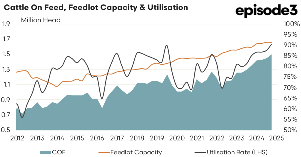 The March 2025 quarter cattle on feed (COF) numbers have been released and they continue to show growth in the sector, despite some strong quarterly turnoff figures for the start of the year. There was nearly 1.5 million head of cattle on feed reported for Q1, 2025 and the capacity of national feedlots dipped marginally, taking the national utilisation ratio from 87% in Q4, 2024 to 90% in Q1, 2025.